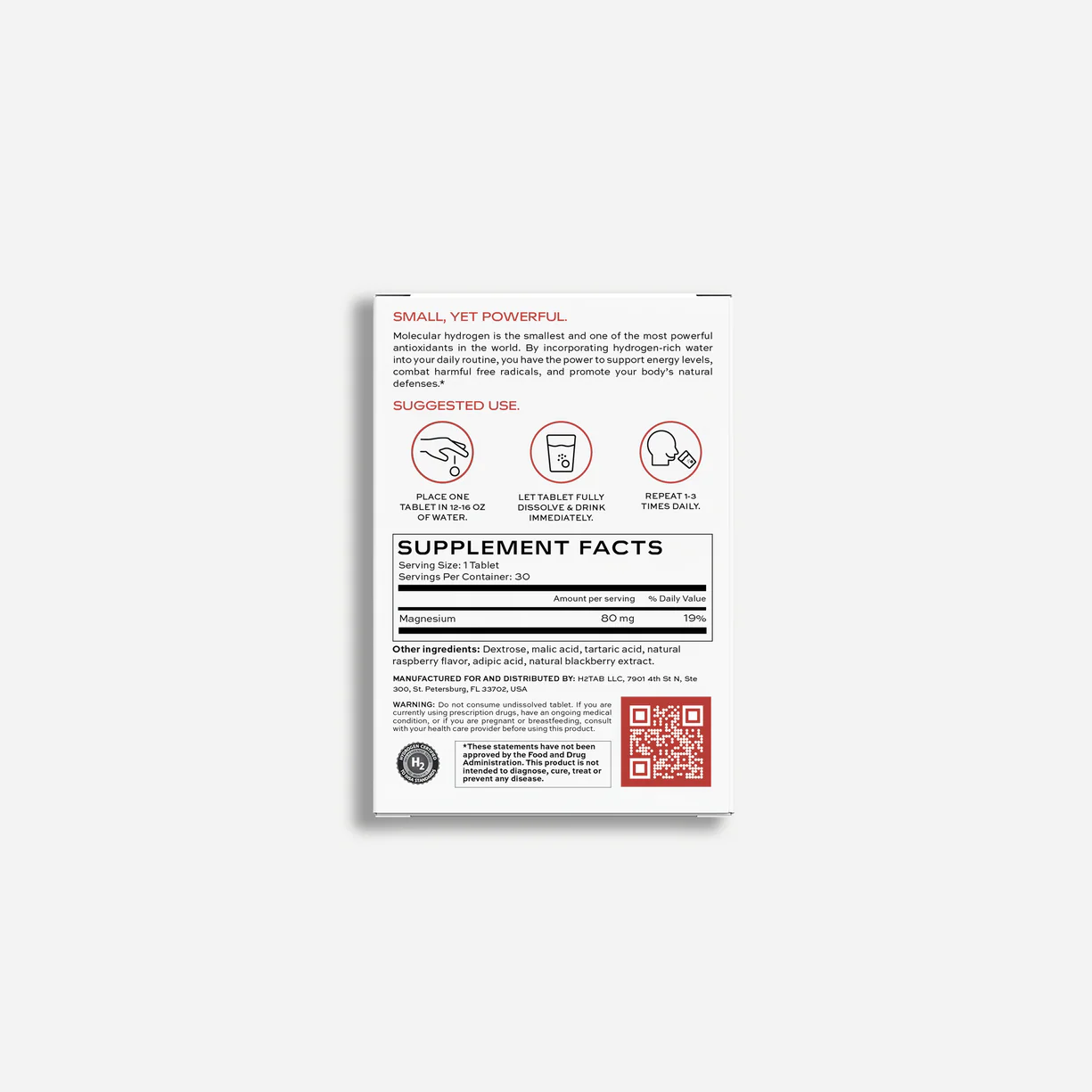 Each pack of H2Tab comes with 30 dissolvable elemental magnesium tablets. When these tablets come in contact with water, they produce millions of nanobubbles filled with pure molecular hydrogen.